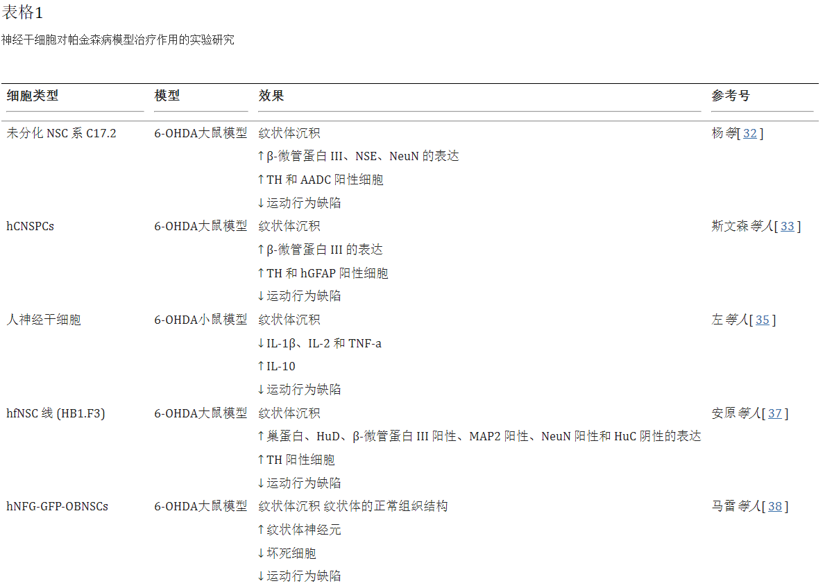 多項(xiàng)臨床前研究表明,不同類(lèi)型的人類(lèi)神經(jīng)干細(xì)胞移植后,可以在特定的大腦部位遷移、存活和增殖。免疫組織化學(xué)檢查支持的證據(jù)表明,移植的人類(lèi)神經(jīng)干細(xì)胞可以轉(zhuǎn)化為功能性神經(jīng)元并整合到神經(jīng)回路中。體內(nèi)研究已證明神經(jīng)干細(xì)胞移植是治療帕金森病的有效方法(表格1)。