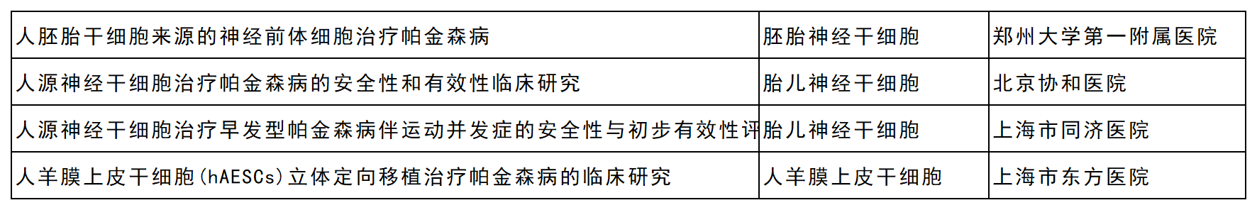 | 孤雌生殖神經干細胞 | 紋狀體和黑質腦內注射 | 十二名患者/(NCT02452723) | 2016–2018 |