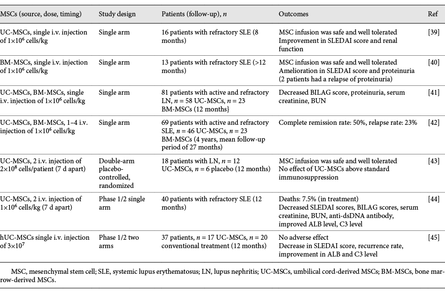 在南京大學醫學院附屬鼓樓醫院的研究中,南京大學醫學院附屬鼓樓醫院招募了更多患者以進一步確定同種異體UC-MSC移植的安全性和有效性。所有MSC移植均在嚴重和耐藥性狼瘡患者中進行。患者隨訪超過12個月,顯示24小時蛋白尿明顯減少,SLEDAI 和不列顛群島狼瘡評估組 (BILAG) 評分有所改善。Cox回歸分析表明完全腎功能緩解與基線臨床參數之間存在顯著相關性,基線血清肌酐水平較高的患者更容易發生腎功能復發。值得注意的是,沒有報告嚴重的不良事件。進一步的II期研究,隨訪長達4年(平均27個月),證明了良好的臨床安全性,總生存率為94%,約 50%的患者在為期4年的訪問。這些研究還表明,同種異體BM-MSC和UC-MSC治療之間的臨床療效沒有差異。