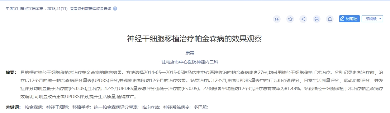 2018年,河南駐馬店市中心醫院神經內二科發表了神經干細胞移植治療帕金森病的效果觀察的文章。