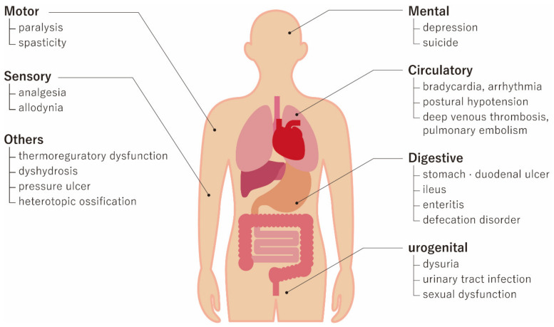 脊髓損傷(SCI)主要由交通事故、跌倒和運動相關(guān)損傷等嚴重外傷引起,全世界有超過 100 萬患者患有 SCI 相關(guān)癱瘓。隨著社會老齡化進程的加快,老年SCI患者因低能量跌倒而增多。SCI 不僅會導致運動功能缺陷,例如癱瘓,還會導致許多其他嚴重的醫(yī)療問題,包括呼吸系統(tǒng)、泌尿生殖系統(tǒng)和皮膚問題(圖1) 。除了嚴重的醫(yī)療問題外,SCI患者通常都很年輕,需要更長時間的醫(yī)療和社會護理,導致嚴重的社會經(jīng)濟問題,不僅對患者及其護理人員,而且對社會也是如此。