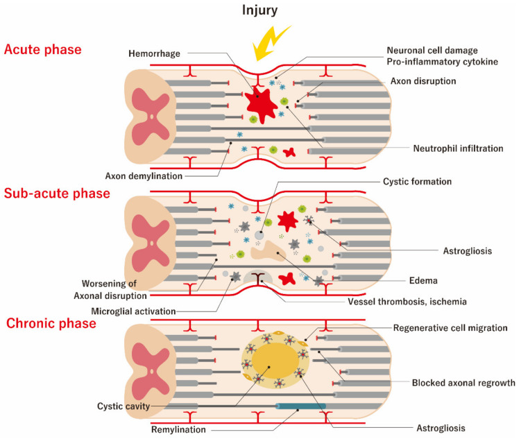 SCI包括兩種截然不同的機制。一種是脊髓受壓挫傷引起的原發(fā)性損傷,導致?lián)p傷時神經(jīng)元和神經(jīng)膠質(zhì)細胞膜的損傷以及微血管系統(tǒng)的破壞。另一種是繼發(fā)性損傷級聯(lián),包括出血和水腫引起的組織腫脹、炎癥、細胞毒性自由基和興奮性毒性物質(zhì)的產(chǎn)生以及過度神經(jīng)膠質(zhì)增生,其發(fā)展需要數(shù)小時至數(shù)月。常規(guī)進行超早期手術(shù)干預,包括脊髓減壓和脊柱固定,但通常很難從SCI中完全恢復,因為原發(fā)性損傷在受傷時已經(jīng)發(fā)生。因此,目前脊髓損傷治療的主要目標是減少或停止繼發(fā)性損傷級聯(lián),繼發(fā)性損傷級聯(lián)可分為急性(數(shù)日內(nèi))、亞急性(數(shù)日至6個月)和慢性(>6個月)相 (圖2)。