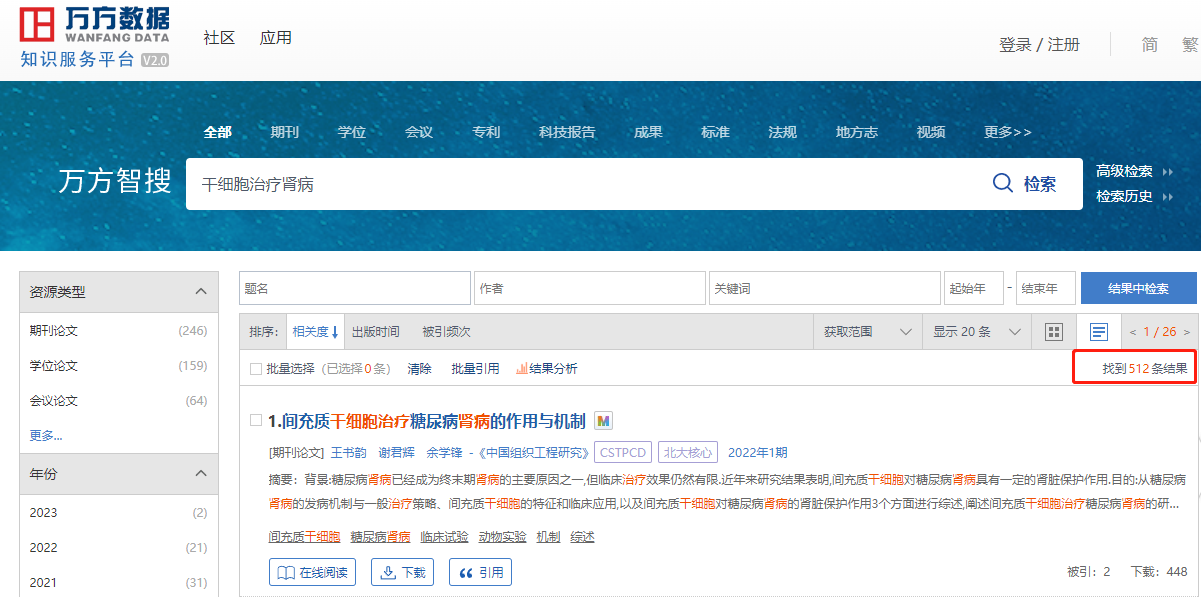 與此同時,在萬方數據通過“干細胞治療腎衰竭”關鍵詞檢索相關文獻,最終結果顯示有關干細胞治療腎病的基礎研究與臨床研究合計多達512條