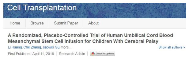 2018年,西安交通大學醫學院神經生物學研究所呂海俠教授在細胞移植期刊(Cell Transplantation)上發表了一篇研究成果。通過隨機、安慰劑對照的臍帶血間充質干細胞輸注治療腦癱患兒,結果顯示臍帶血治療組患兒的癥狀改善程度顯著優于對照組。證實臍帶間充質干細胞治療腦癱安全且效果顯著。