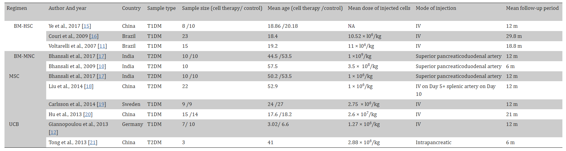 值得注意的是,只有五項研究包括接受安慰劑或胰島素的對照組,以及接受干細(xì)胞移植的治療組。隨訪期從六個月到29.8個月不等。
