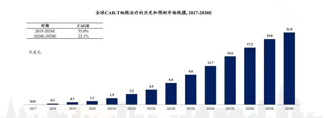 細(xì)胞與基因治療(Cell?&?Gene?Therapy,CGT)是當(dāng)前生物醫(yī)藥領(lǐng)域最火熱的賽道之一,免疫細(xì)胞治療、干細(xì)胞治療、基因治療相關(guān)的進(jìn)展可謂是日新月異。CAR-T療法作為近幾年抗癌療法的寵兒,短短十余年的探索,其有效性陸續(xù)得到驗(yàn)證,從臨床研發(fā)走向商業(yè)化。根據(jù)沙利文分析,預(yù)測(cè)全球在2030年CAR-T療法的市場(chǎng)規(guī)模將達(dá)到218億美元。