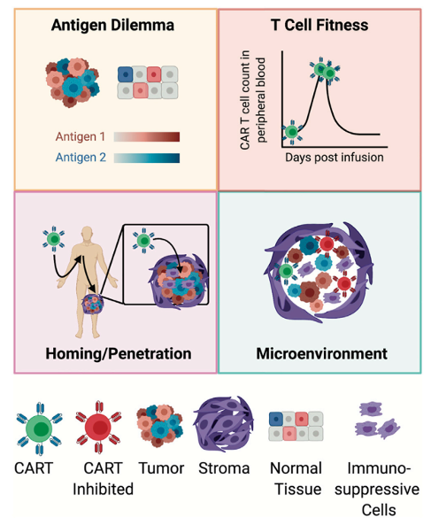 目前 CAR-T 治療實體瘤,應答率和有效率都極低,相關機制討論中,涉及缺乏特異性腫瘤相關抗原,物理屏障阻隔 CAR-T 穿透入實體瘤內部,惡劣的腫瘤微環境誘導 CAR-T 功能耗竭等。
