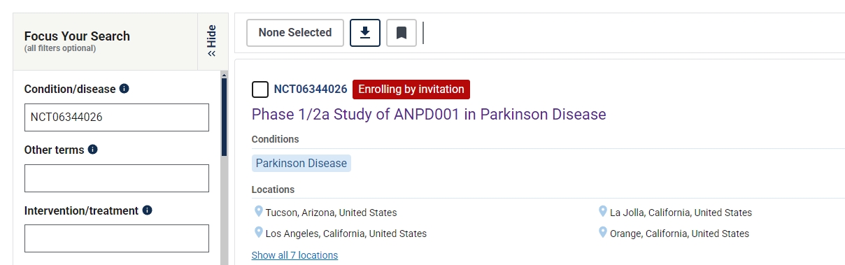 ANPD001是美國(guó)最先進(jìn)的治療帕金森病的自體研究性新細(xì)胞療法。有關(guān)1/2a期試驗(yàn)的更多信息,請(qǐng)?jiān)L問clintrials.gov (NCT06344026)。