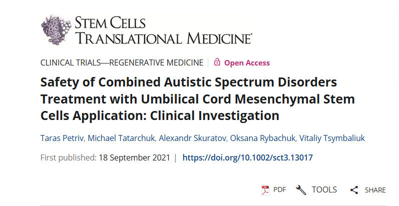 2021年9月18日,烏克蘭基輔 HEMAFUND 有限公司醫(yī)療中心在國際期刊《Stem Cell Translational Medicine》上發(fā)布了一篇《臍帶間充質(zhì)干細(xì)胞應(yīng)用治療自閉癥譜系障礙的安全性:臨床研究》的研究結(jié)果。本研究的目的是調(diào)查對 ASD 兒童進(jìn)行 UC-MSCs 聯(lián)合(鞘內(nèi)和靜脈)給藥的安全性。