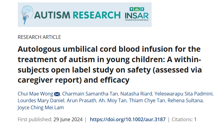 2024年6月29日,新加坡竹腳婦幼醫(yī)院 (KKH) 在國際期刊《AUTISM RESEARCH》上發(fā)布了一篇《自體臍帶血輸注治療幼兒自閉癥:一項關(guān)于安全性(通過護(hù)理人員報告評估)和有效性的受試者內(nèi)開放標(biāo)簽研究》的研究結(jié)果,本研究旨在記錄單次輸注自體臍帶血 (UCB) 對 20 名 24-72 個月大的自閉癥兒童的安全性和有效性。
