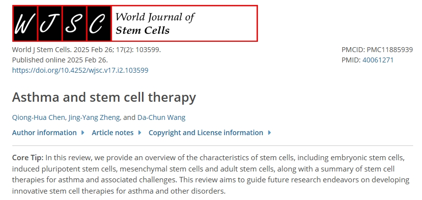2025年,世界干細胞雜志發(fā)表了一篇“Asthma and stem cell therapy”(干細胞治療哮喘)的文章。