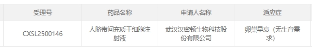 5月14日,國家藥監局藥品審評中心(CDE)公布,人臍帶間充質干細胞注射液(CXSL2500146)正式獲批開展治療卵巢早衰(無生育需求)的臨床試驗。這是我國首次明確針對卵巢早衰的臍帶干細胞藥物項目。[5]