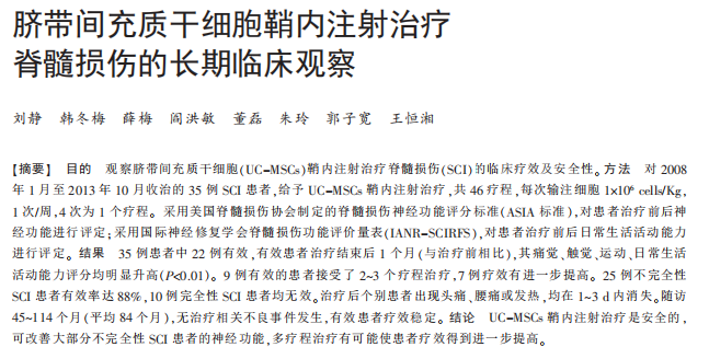 2018年,空軍總醫(yī)院與北京放射與輻射醫(yī)學(xué)研究所公布了臍帶間充質(zhì)干細(xì)胞鞘內(nèi)注射治療脊髓損傷的長(zhǎng)期臨床觀察結(jié)果。22例有效SCI患者接受臍帶間充質(zhì)鞘內(nèi)注射治療,結(jié)果表明UC-MSCs鞘內(nèi)注射治療是安全的,可改善大部分不完全性SCI患者的神經(jīng)功能,多療程治療有可能使患者療效得到進(jìn)一步提高。