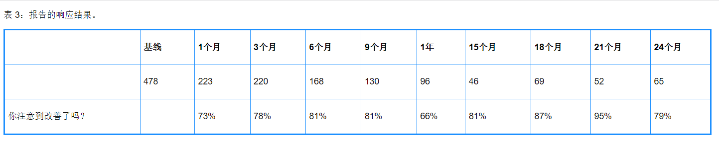 術后12個月,66%報告改善 (N=96),術后15個月,81%報告改善 (N=46),術后18個月手術后,87%報告改善 (N=69),手術后21個月,95% 報告改善 (N=52),手術后24個月,79%報告改善 (N=65)。