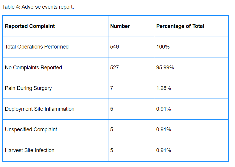 在接受治療的549名患者中,沒有報告嚴重不良事件,例如需要住院治療、需要隨訪手術、神經功能缺損、椎間盤炎、血栓栓塞事件、硬膜外血腫或膿腫、死亡或其他嚴重并發癥(表3)。