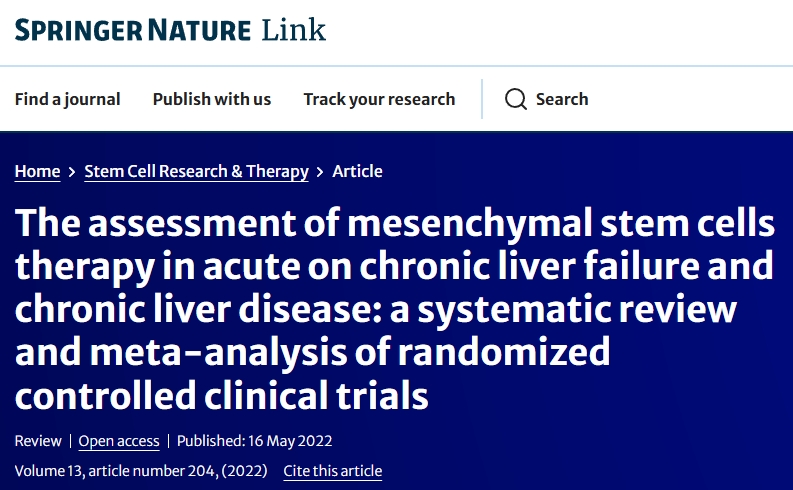 2022年,期刊雜志《干細胞研究與治療》刊發了一篇“間充質干細胞治療慢性肝衰竭急性發作和慢性肝病的評估:隨機對照臨床試驗的系統評價和薈萃分析”。