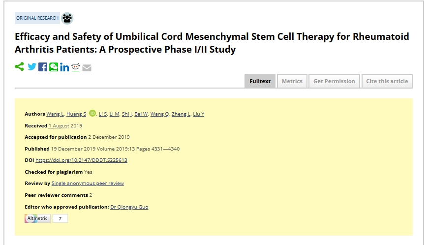 治療期間,患者在輸注100mL生理鹽水后立即通過靜脈注,40mLUC-MSC懸浮產品(2×10^7細胞/20mL)。使用血清學標志物測試來評估安全性,使用28關節疾病活動評分 (DAS28) 和健康評估問卷 (HAQ) 來評估UC-MSCs治療RA的長期效果和安全性。研究結果發表在《Dove Press》。