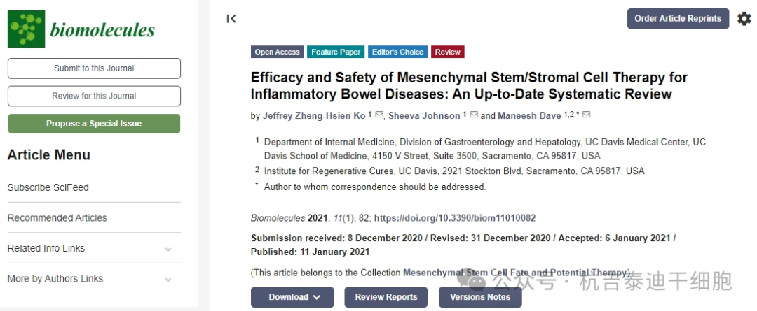 炎癥性腸病(IBD):2021年,期刊雜志《Biomolecules》生物分子發表了一篇間充質干細胞/基質細胞治療炎癥性腸病的療效和安全性:最新系統評價的文章,該綜述旨在介紹有關MSC療法在IBD中的安全性和有效性的最新研究。