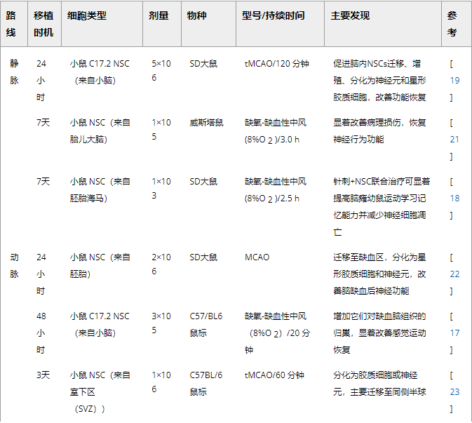表1:靜脈和動脈NSC移植治療腦缺血的代表性實(shí)驗(yàn)研究。