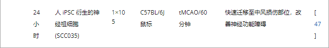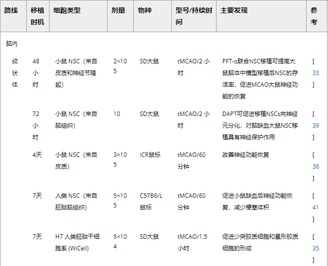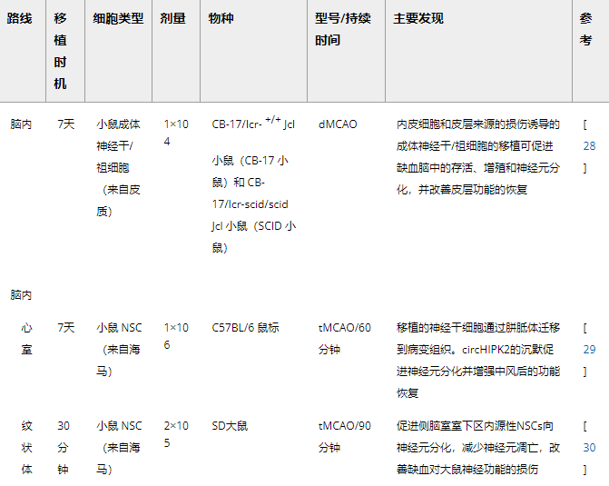 表4. 腦內(nèi)(胼胝體、大腦皮層和海馬)NSC移植治療腦缺血的代表性實(shí)驗(yàn)研究。
