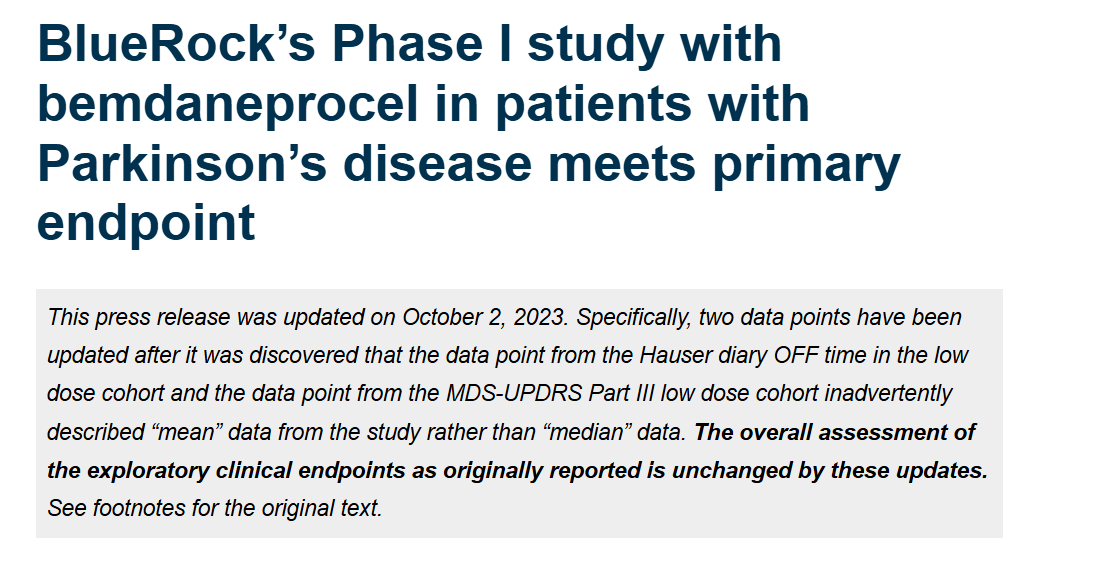 2023年10月2日,拜耳公司子公司 BlueRock Therapeutics LP 今天公布了 bemdaneprocel (BRT-DA01) I 期臨床試驗的積極數(shù)據(jù)詳情,bemdaneprocel 是一種用于治療帕金森病的干細(xì)胞衍生試驗療法。