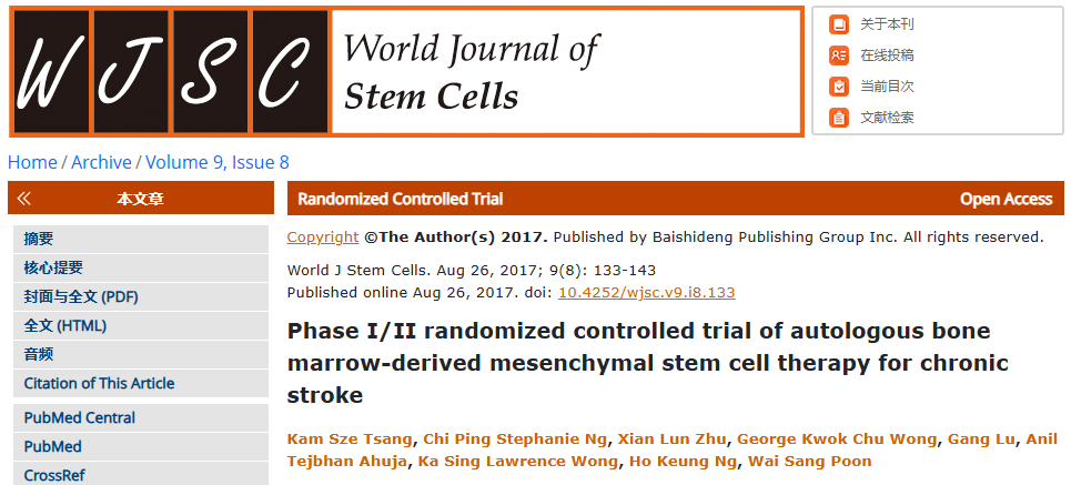 2017年,Tsang等的自體骨髓間充質(zhì)干細(xì)胞療法治療慢性卒中的I/II期隨機(jī)對(duì)照試驗(yàn)顯示,自體骨髓MSC移植相比安慰劑改善了神經(jīng)功能恢復(fù)。