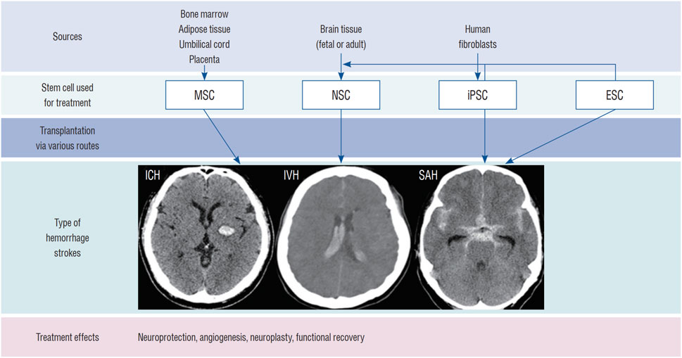 圖3:用于治療ICH的干細(xì)胞類(lèi)型:該圖顯示了用于治療ICH(腦實(shí)質(zhì)出血、腦室內(nèi)出血[IVH]和蛛網(wǎng)膜下腔出血[SAH])的干細(xì)胞類(lèi)型,包括 NSC、間充質(zhì)干細(xì)胞 (MSC)、誘導(dǎo)多能干細(xì)胞 (iPSC) 和胚胎干細(xì)胞 (ESC)。
