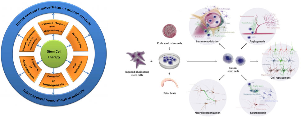 圖2:干細(xì)胞和NSC在ICH中的治療機(jī)制:闡明了其保護(hù)作用,包括修復(fù)、替代、神經(jīng)營(yíng)養(yǎng)支持、抗凋亡、抗炎、血管再生、神經(jīng)發(fā)生、免疫調(diào)節(jié)、神經(jīng)修復(fù)、分化為星形膠質(zhì)細(xì)胞/神經(jīng)元/少突膠質(zhì)細(xì)胞以及宿主組織整合——最終增強(qiáng)組織修復(fù)和神經(jīng)功能恢復(fù)。