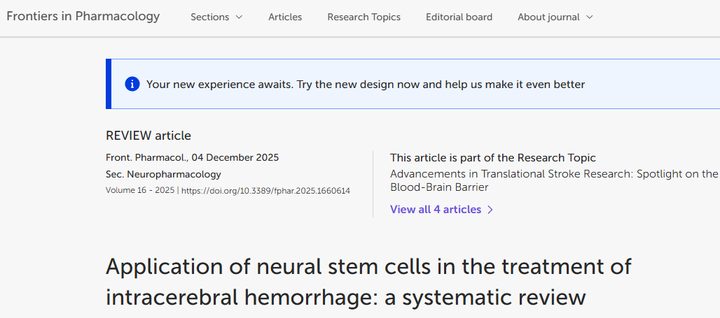 [1]Song P, Shafiq Z, Jiang H and Cai Q (2025) Application of neural stem cells in the treatment of intracerebral hemorrhage: a systematic review. Front. Pharmacol. 16:1660614. doi: 10.3389/fphar.2025.1660614