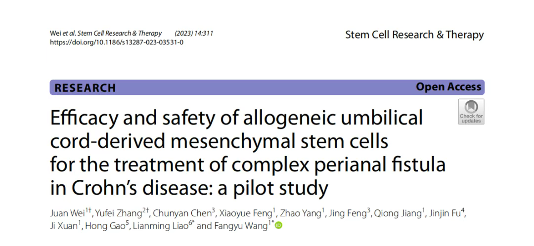 [3]Wei, J., Zhang, Y., Chen, C. et al. Efficacy and safety of allogeneic umbilical cord-derived mesenchymal stem cells for the treatment of complex perianal fistula in Crohn’s disease: a pilot study. Stem Cell Res Ther 14, 311 (2023). https://doi.org/10.1186/s13287-023-03531-0