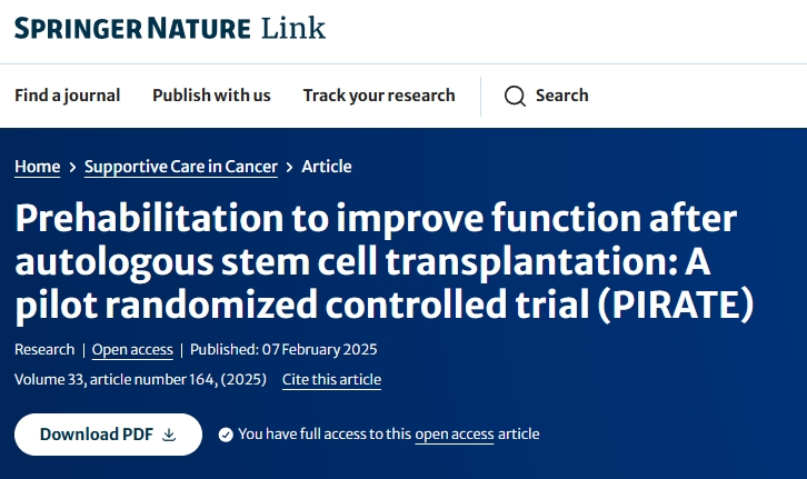 參考資料:Dennett, A.M., Porter, J., Ting, S.B.?et al.?Prehabilitation to improve function after autologous stem cell transplantation: A pilot randomized controlled trial (PIRATE).?Support Care Cancer?33, 164 (2025). https://doi.org/10.1007/s00520-025-09179-1