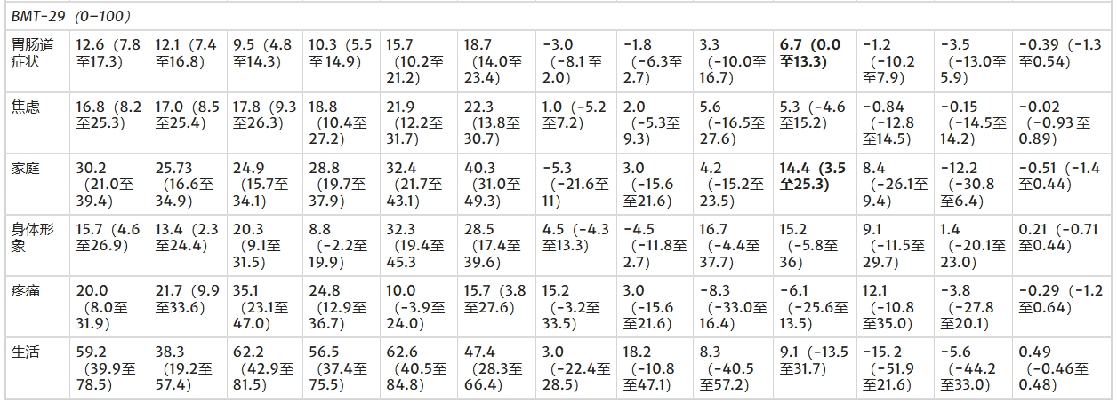 小結:在次要患者結局方面,實驗組在生活質量的 “身體功能” 和 “角色功能” 子量表上顯著優于對照組,且在體重、認知、社會功能等多項指標上呈現中到大效應的改善趨勢,盡管部分指標(如呼吸困難、胃腸道癥狀)未達統計學顯著。但實驗組在體力活動和營養攝入達標率上與對照組無差異,約17%的參與者存在鈣缺乏。健康服務結局顯示,兩組干細胞植入時間無顯著差異,提示干預措施未對治療流程關鍵時間節點產生影響。