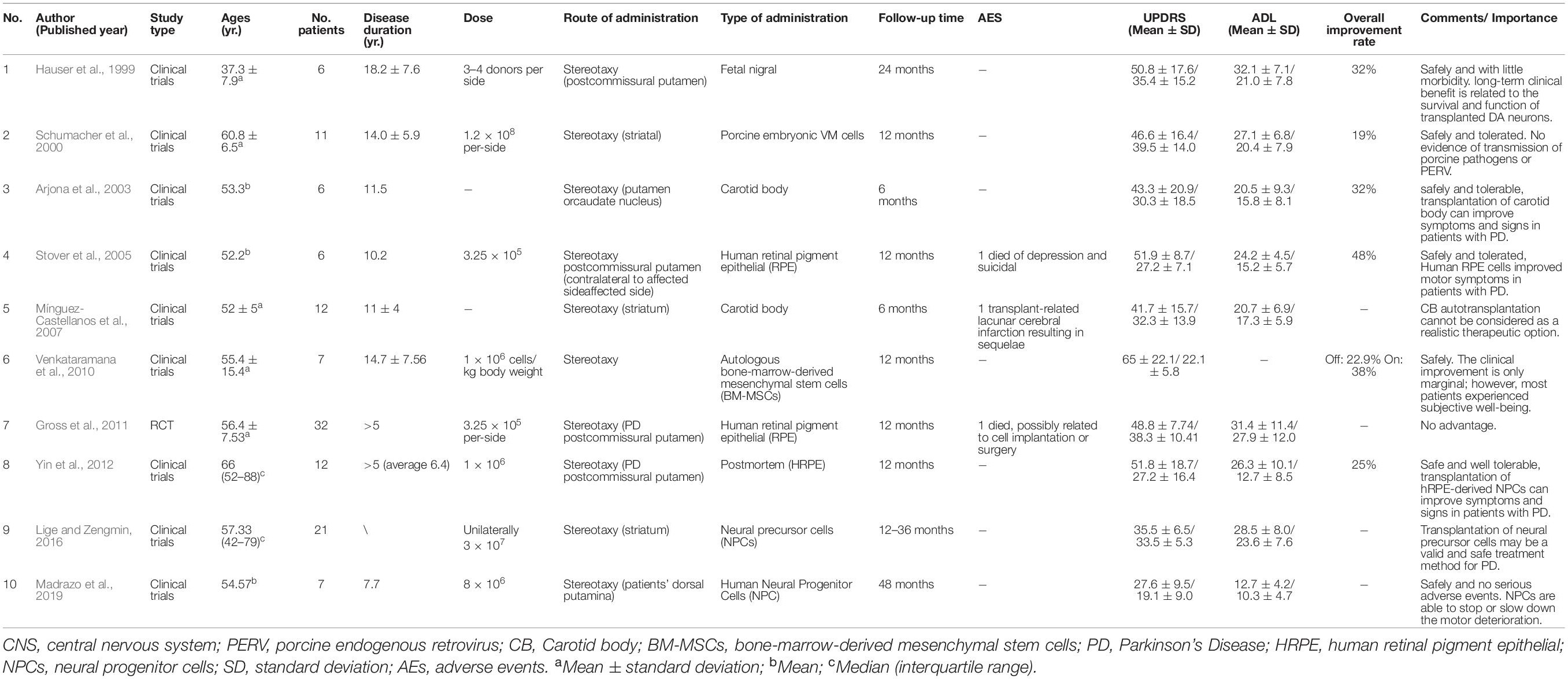 主要結果:表1顯示了最終文獻綜述中包含的文章的特征。這10項納入的研究是在1999年至2019年期間進行的,包括120名接受細胞療法的帕金森病患者。涉及五種類型的細胞療法,包括人類胎兒、豬胚胎、BM-MSCs、HRPE和NPC。所有研究均采用立體定向移植。七項研究報告了UPDRSIII的顯著改善,2項研究顯示結果不佳。安全性方面,7篇報道細胞移植安全且耐受性好,3篇報道細胞移植相關并發(fā)癥,包括抑郁自殺傾向、細胞移植相關腦梗死(有后遺癥)、細胞移植手術相關并發(fā)癥死亡(表1)。