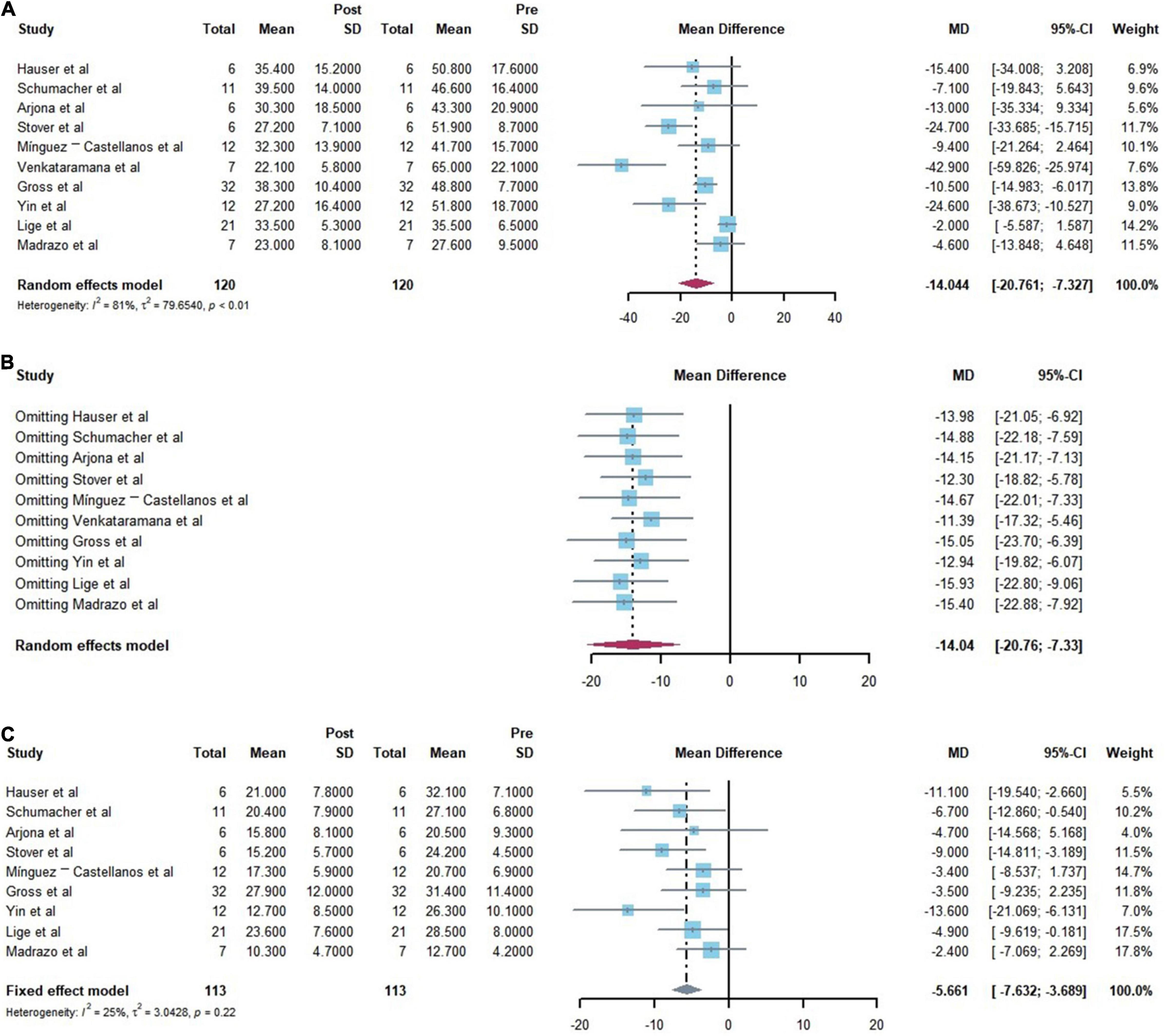 基于不同隨訪時間的結果:隨訪=6–12個月 -18.061(95%CI:-26.301;-9.820)I2=73.7%;隨訪>18個月-2.912(95% CI:-6.590;0.767)I2= 4.6%,(亞組差異檢驗:P< 0.001)。值得注意的是,亞組的異質性降低了,表明這些因素是潛在的異質性來源。更具體地說,最好的改善是在術后近1年時實現的(表2)。