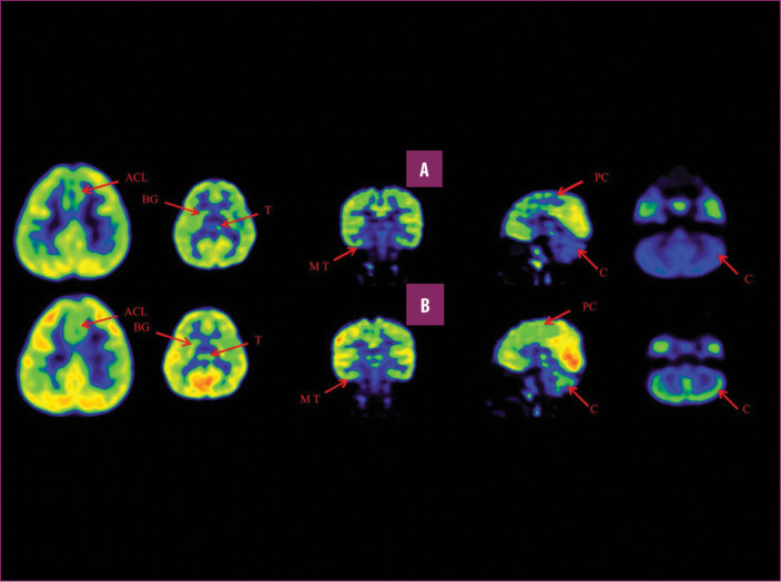 前扣帶回 (ACL)、頂葉皮層 (PC)、內(nèi)側(cè)顳葉皮層 (MT)、基底神經(jīng)節(jié) (BG)、丘腦 (T) 和小腦 (C)。B 行)第一次移植后6個月后PETCT腦部掃描的干預(yù)后圖像顯示標(biāo)記區(qū)域有所改善。藍色代表代謝減退區(qū)域。綠色代表正常的新陳代謝區(qū)域。圖A和B的比較顯示藍色區(qū)域顯著減少,綠色區(qū)域增加,這表明大腦的新陳代謝得到改善。