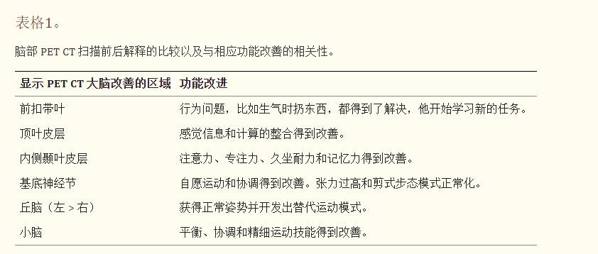 與之前的情況相比,他在矢狀面和額狀面上的體重變化有所改善;頭部、軀干和骨盆的排列也得到改善,雙側(cè)腿筋和小腿肌肉的緊繃感也有所減輕。患者開始執(zhí)行雙手任務(wù)。在認知方面,由于他定期上學(xué),他的注意力持續(xù)時間和久坐耐力也得到了改善。GMFM評分從60.67提高到67.75;GMFCS等級由Level3提升至Level2;和FIM評分從97分提高到99分。在比較第一次細胞治療之前和之后七個月期間進行的腦部PETCT掃描結(jié)果時,前扣帶葉、頂葉皮層、內(nèi)側(cè)顳葉皮層、丘腦、基底神經(jīng)節(jié)和小腦(表格1)。
