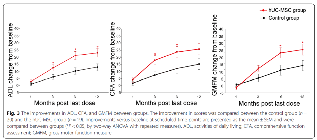 結果表明:共39例患者接受治療并完成預定的評估。hUC-MSC治療組與對照組不良事件(AEs)差異無統計學意義。此外,與對照組比較,hUC-MSC治療組ADL、CFA和GMFM量表評分顯著改善。說明hUC-MSC移植結合康復在改善腦癱患兒粗大運動和健康功能方面是安全有效的。