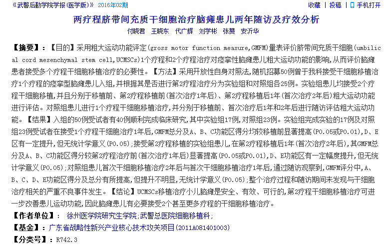 2016年,徐州醫學院研究生學院研究人員發表論文,旨在采用粗大運動功能評定量表評價臍帶間充質干細胞1個療程和2個療程治療對痙攣性腦癱患兒粗大運動功能的影響,從而評價腦癱患者接受多個療程干細胞移植治療的必要性。研究指出,臍帶間充質干細胞移植治療小兒腦癱是安全、有效、可行的,第2療程干細胞移植治療可進一步改善患兒運動功能,因此腦癱患兒有必要接受2個甚至更多療程的干細胞移植治療。該文發表在2016年第02期《武警后勤學院學報(醫學版)》雜志上。