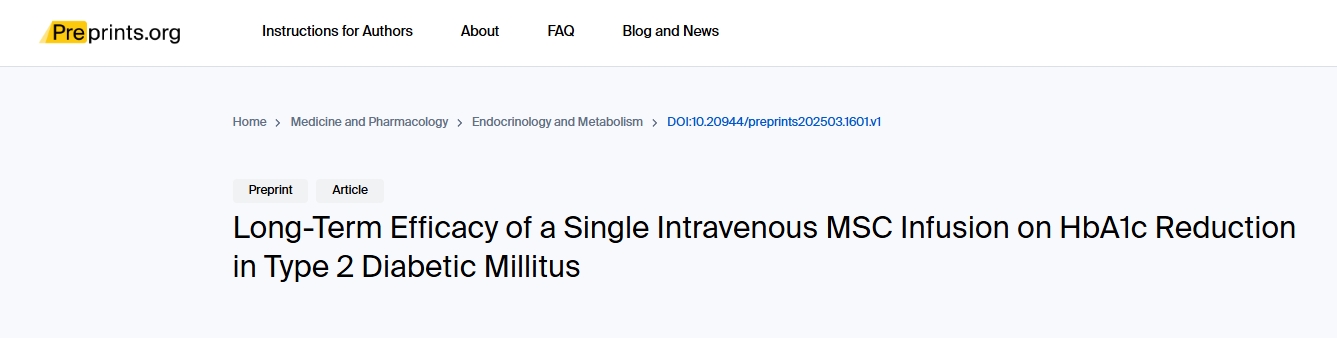 2025年3月21日,醫學期刊雜志《Medicine and Pharmacology》發表了一篇“單次靜脈輸注MSC對2型糖尿病患者降低HbA1c的長期療效”的臨床研究文章[2]。
