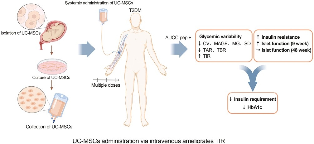 結論:靜脈輸注UC-MSCs,通過短期時間隨訪驗證可顯著提升T2D患者的血糖達標時間(TIR)和糖化血紅蛋白(HbA1c)水平,且療效優于安慰劑,為糖尿病治療提供了新的循證醫學證據。