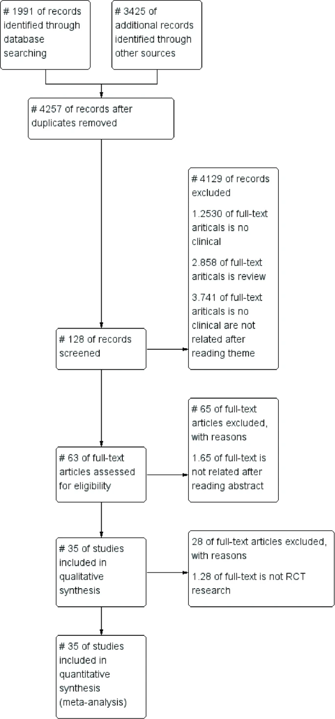 流程圖概述:通過系統(tǒng)檢索PubMed(1991篇)、Embase及Cochrane數(shù)據(jù)庫(kù)(共3425篇),初步納入5416篇文獻(xiàn),經(jīng)去重后剩余4257篇。按排除標(biāo)準(zhǔn)分步篩選:排除2530篇非臨床研究(如基礎(chǔ)實(shí)驗(yàn)、動(dòng)物研究)、858篇綜述、741篇摘要不相關(guān)文獻(xiàn)、65篇全文不相關(guān)文獻(xiàn)及28篇不符合RCT設(shè)計(jì)的文獻(xiàn),最終納入35項(xiàng)研究進(jìn)行薈萃分析(圖1)。