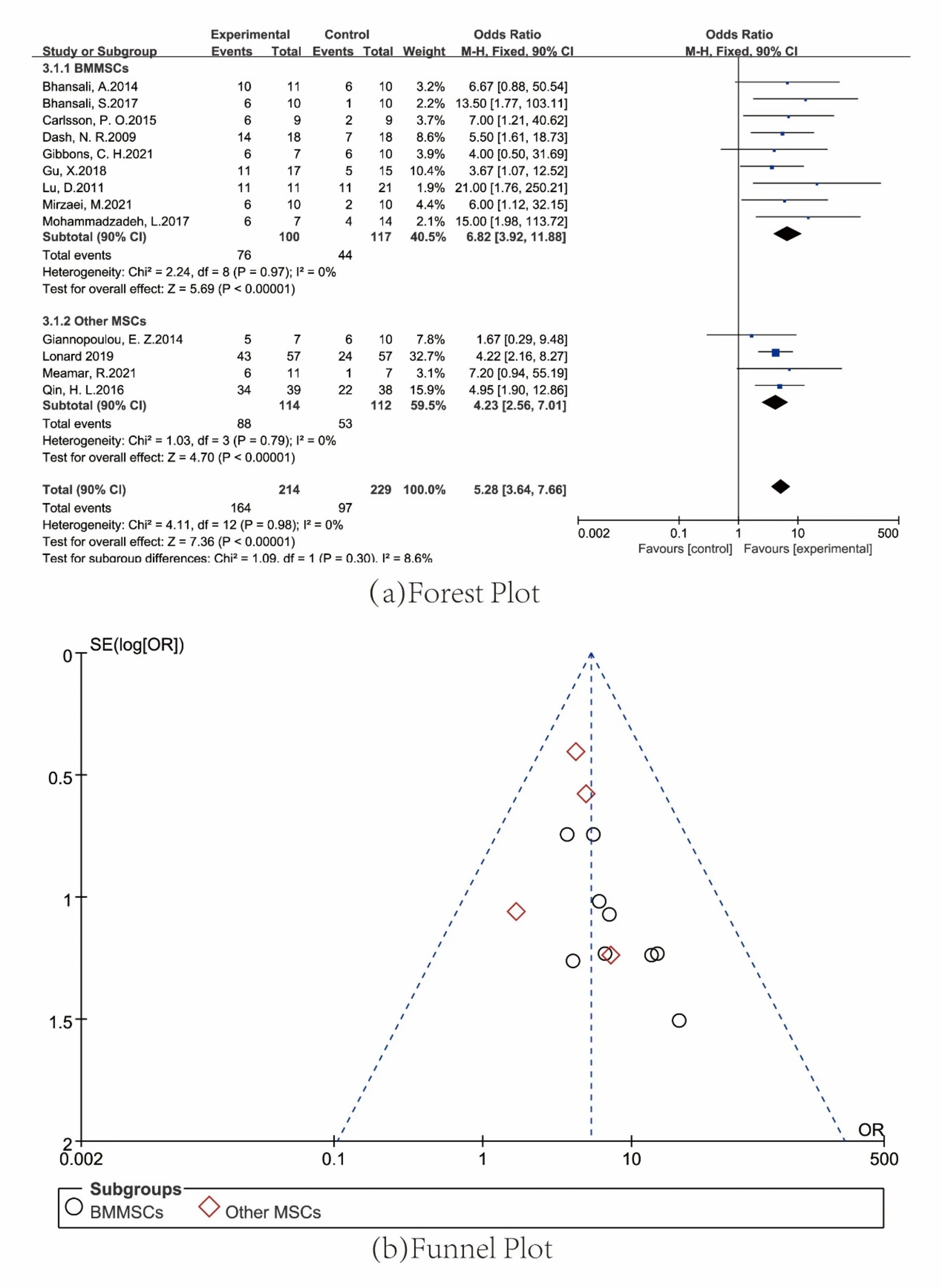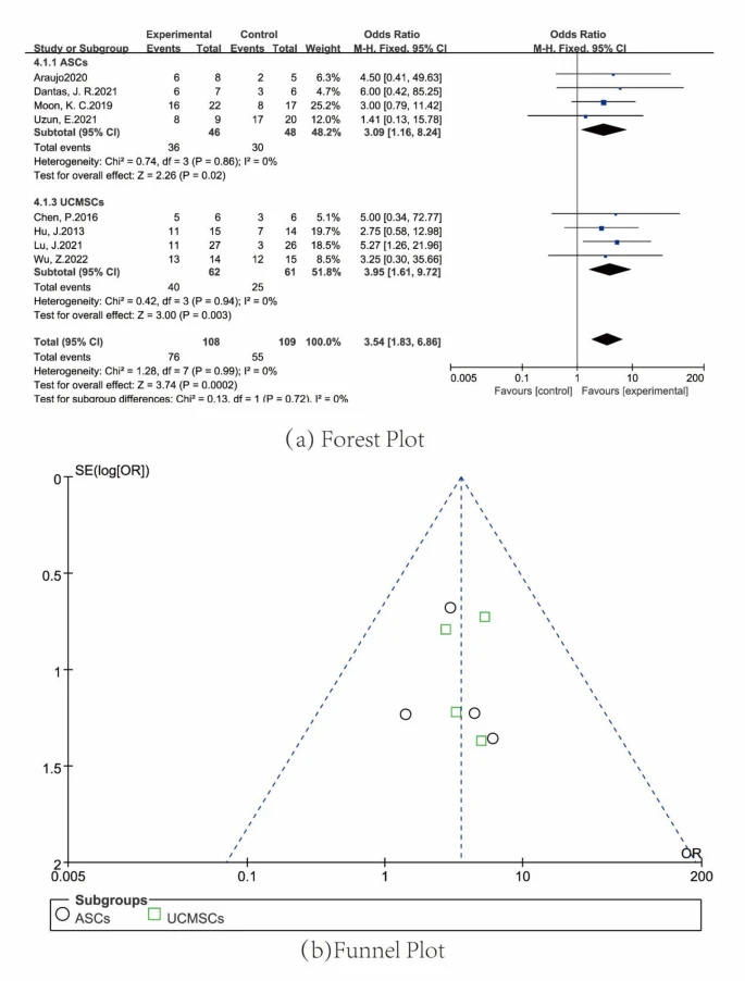自體MSCs亞型的療效與特性對(duì)比:自體間充質(zhì)干細(xì)胞(MSCs)中,骨髓源性MSCs(BMMSCs)在糖尿病治療中表現(xiàn)最優(yōu),其薈萃分析OR值達(dá)6.82(實(shí)驗(yàn)組100例vs對(duì)照組117例),顯著高于其他來源MSCs(OR=4.23),這表明BMMSC在糖尿病治療中具有更重要的作用(圖6ab)。