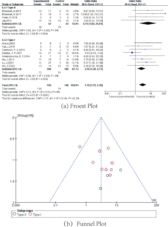 本研究通過薈萃分析評(píng)估間充質(zhì)干細(xì)胞治療1型糖尿病與2型糖尿病的療效差異。基于12項(xiàng)研究(8項(xiàng)I型、4項(xiàng)II型)的二分類數(shù)據(jù),固定效應(yīng)模型顯示MSCs對(duì)兩類糖尿病均具有顯著療效,且置信區(qū)間未跨越無效值。分層分析表明,II型糖尿病的效應(yīng)值(6.76)顯著高于I型(2.56),表明MSCs在治療II型糖尿病方面更有效。這些數(shù)據(jù)為糖尿病提供了新的見解,其中MSCs是治療II型糖尿病最有效的方法。
