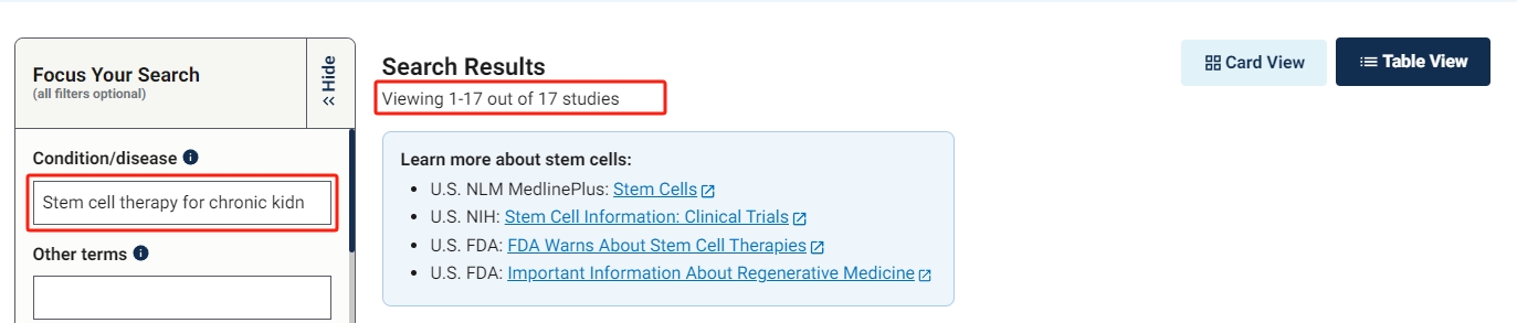 截止2023年11月,在美國國立衛生研究院的最大臨床試驗注冊庫clinicaltrials.gov網站上注冊的有關干細胞治療慢性腎病的臨床研究項目有17項