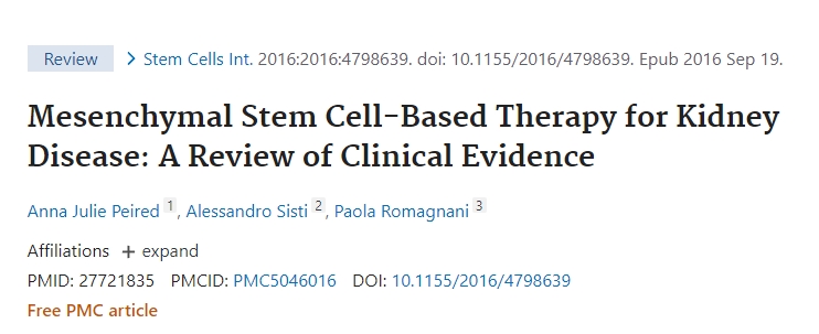 2019年,Cinzia Rota等人在《International journal of molecular sciences》雜志發表了一篇題為《 腎臟疾病的干細胞治療:進展與挑戰 》文章,描述了全球16項關于干細胞療法在慢性腎病領域的臨床試驗結果,總結了當前的研究進展和進入臨床應用的前景。