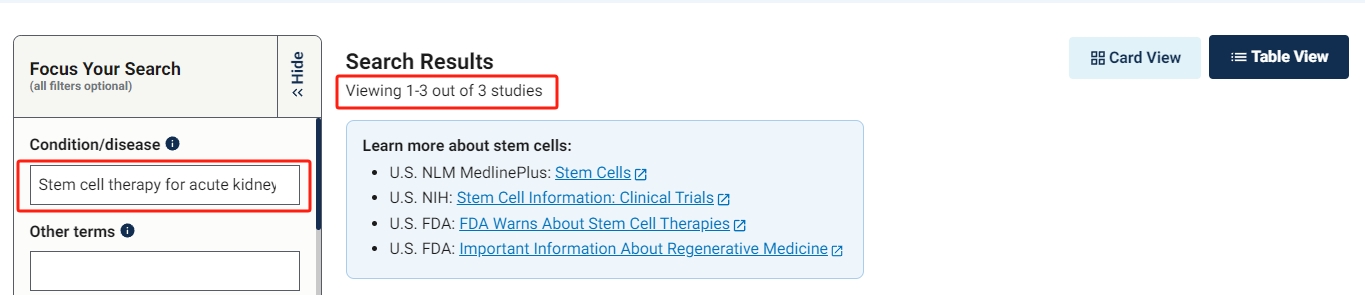 截止2023年11月,在美國國立衛生研究院的最大臨床試驗注冊庫clinicaltrials.gov網站上注冊的有關干細胞治療急性腎損傷的臨床研究項目有3項