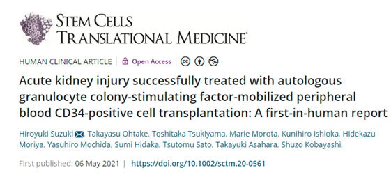2021年日本湘南鐮倉綜合醫院研究團隊在《干細胞轉化醫學》上發表文章,分享了利用自體干細胞移植成功治療急性腎損傷患者的經驗。