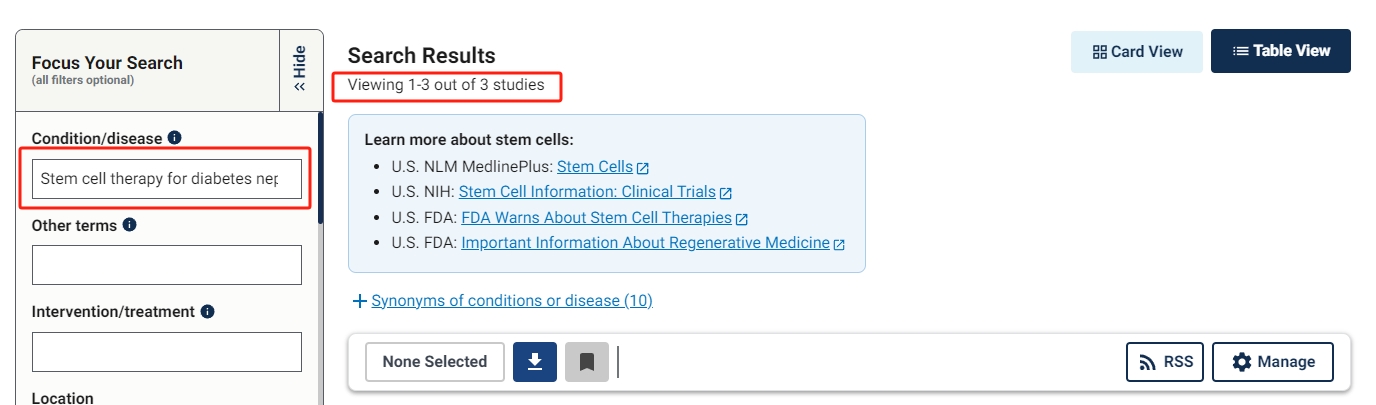 截止2023年11月,在美國國立衛生研究院的最大臨床試驗注冊庫clinicaltrials.gov網站上注冊的有關干細胞治療糖尿病腎病的臨床研究項目有3項