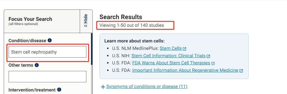 截止目前為止,美國國立衛生數據庫(ClinicalTrials.gov)收錄的干細胞治療腎病的臨床試驗有140項