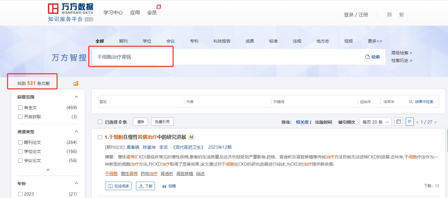 同一時間段,我們在中國萬方數據知識平臺運用關鍵詞“干細胞治療腎病”搜索相關干細胞治療腎病的文章,發現干細胞治療腎病的論文多達531條